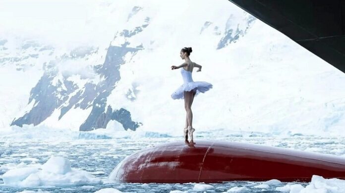 Μια μπαλαρίνα χορεύει στην πλώρη ενός πλοίου που διασχίζει τα νερά της Ανταρκτικής