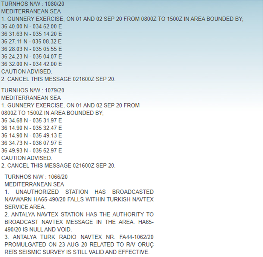 Σύμφωνα με πληροφορίες, με τη νέα NAVTEX θα πραγματοποιηθεί άσκηση με πραγματικά πυρά στην Ανατολική Μεσόγειο από 1 έως 2 Σεπτεμβρίου.