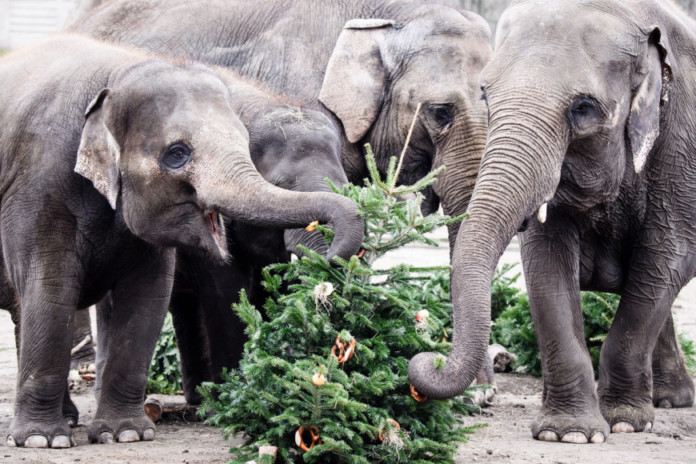 Φέτος, οι ελέφαντες έφαγαν τα δέντρα, αλλά οι σκαντζόχοιροι και οι καμήλες δέχθηκαν επίσης λιχουδιές που είχαν καρφωθεί στα κλαδιά των ελάτων. Ο ζωολογικός κήπος κυκλοφόρησε φωτογραφίες με το σπέσιαλ γεύμα που δόθηκε στα ζώα.