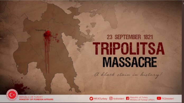 Το τουρκικό υπουργείο Εξωτερικών, σε μια άκρως προκλητική ενέργεια, επιχειρεί να παρουσιάσει ως θύματα τους Τούρκους κατακτητές της Ελλάδας και χαρακτηρίζει την Απελευθέρωση της Τριπολιτσάς κατά την Επανάσταση του 1821, ως «απάνθρωπη σφαγή Τούρκων».