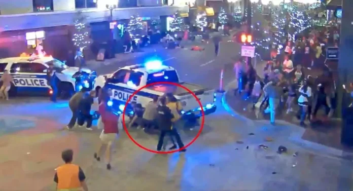 Βίντεο, δείχνει τη στιγμή που ο νεαρός ένοπλος ανοίγει πυρ και συλλαμβάνεται από έναν αστυνομικό ο οποίος τον διατάζει να πέσει στο έδαφος.
