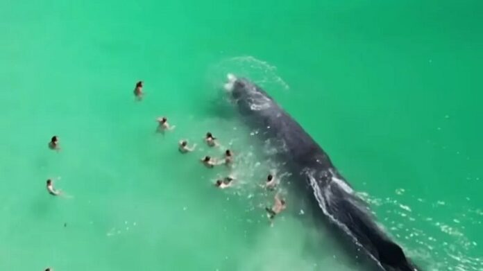 Πολλοί κολυμβητές φαίνονταν στα βίντεο, τα οποία δημοσιοποιήθηκαν, να πλησιάζουν τη φάλαινα.