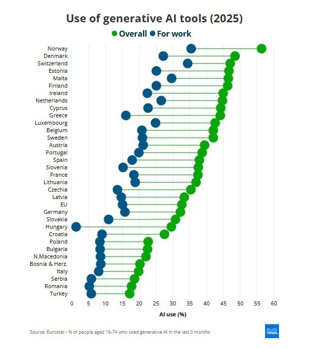 Σε 33 ευρωπαϊκές χώρες, η χρήση της τεχνητής νοημοσύνης στον χώρο εργασίας κυμαίνεται από μόλις 1,3% στην Ουγγαρία έως 35,4% στη Νορβηγία, με την Ελβετία να ακολουθεί από κοντά με 34,4%.