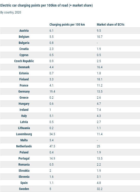 Στον αντίποδα, η Ολλανδία (47,5), το Λουξεμβούργο (34,5) και η Γερμανία (19,4) είναι οι τρεις πρώτες χώρες σε ό,τι αφορά τους περισσότερους φορτιστές για κάθε 100 χιλιόμετρα οδικού δικτύου.