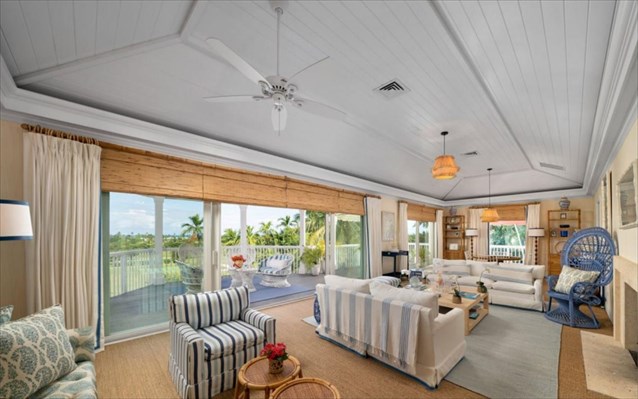 Με θέα στο γήπεδο γκολφ Lyford Cay και το Club, το σπίτι διαθέτει ένα τζάκι από κοραλλιογενείς πέτρες, θολωτές βεράντες, ένα πέτρινο φουαγιέ, μια σπειροειδή σκάλα και ένα υπαίθριο σαλόνι. Μια γέφυρα πάνω από την πισίνα οδηγεί στους κήπους που είχε επιμεληθεί η ίδια η Τζάκι Κέννεντυ Ωνάση.