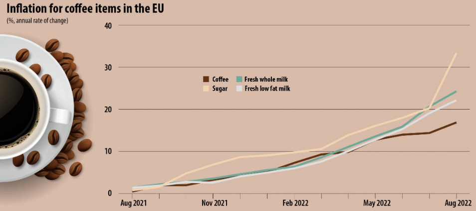 Τα στοιχεία του Αυγούστου δείχνουν ότι η τιμή του καφέ στις χώρες της ΕΕ είναι κατά 16,9% υψηλότερη σε σχέση με τον Αύγουστο του 2021, η οποία με τη σειρά της ήταν κατά 0,5% υψηλή από εκείνη του Αυγούστου του 2020. Από τον Οκτώβρη του 2021, ο ετήσιος πληθωρισμός κάνει άλματα.