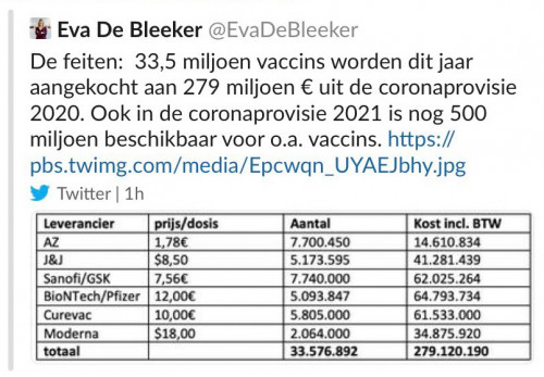 Η Εύα Ντε Μπλέεκερ την Πέμπτη ανάρτησε στο Twitter έναν πίνακα με την τιμή κάθε εμβολίου που έχει αγοράσει η ΕΕ και πόσα θα δαπανήσει συνολικά το Βέλγιο για αυτά, σύμφωνα με τη βελγική ιστοσελίδα HLN. Aν και το tweet διεγράφη, η ιστοσελίδα δημοσίευσε ένα screenshot.