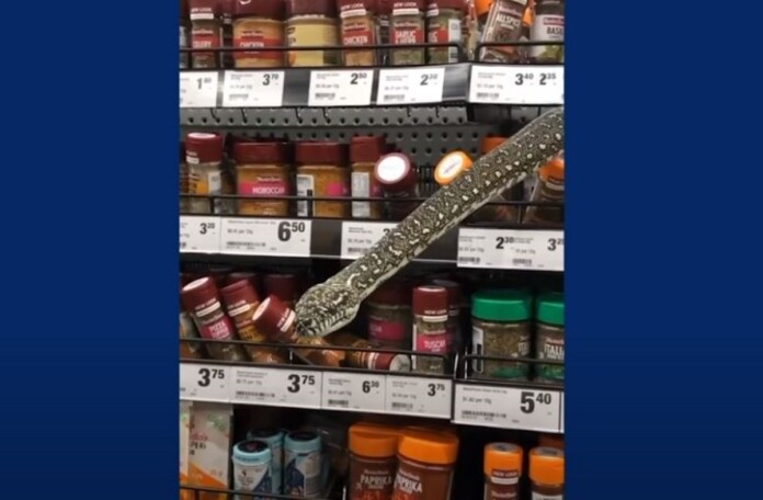 Η 25χρονη κοπέλα ήταν σε ένα σούπερ μάρκετ της αλυσίδας Woolworths, όταν ξαφνικά είδε το πελώριο φίδι να ξεπροβάλλει μέσα από το ράφι με τα μπαχαρικά. Το εν λόγω σούπερ μάρκετ – όπως αναφέρει το δημοσίευμα του BBC – βρίσκεται στο άκρο μιας μεγάλης έκτασης με αρκετά πυκνή βλάστηση. Tο τελευταίο όμως πράγμα που περίμενε η νεαρή κοπέλα είναι ότι θα έβλεπε έναν πύθωνα μήκους τριών μέτρων να την κοιτάζει μέσα από τα μπουκαλάκια με την πάπρικα, το σκόρδο και το πιπέρι.