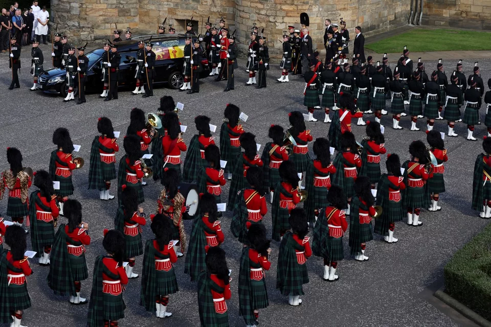 Την αυτοκινητοπομπή περιστοίχιζαν στρατιωτικοί, ντυμένοι με σκωτσέζικες ενδυμασίες.