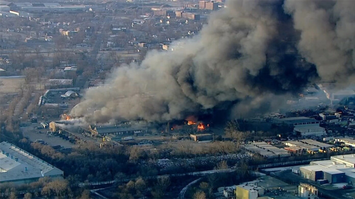 📌#Chicago | #ILMultiple Fire departments and other agencies are responding to a massive fire at shipping warehouses factory in Chicago Heights IL with reports of thick, black smoke can be seen miles away pic.twitter.com/ajeW96UY4r