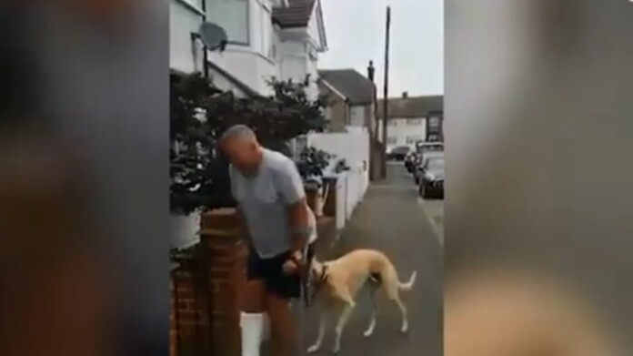 Στο βίντεο ο σκύλος προσέχει τον ιδιοκτήτη του όπως περπατάει με την πατερίτσα προς το σπίτι του και μπαίνει στην αυλή.