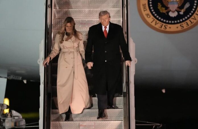 Ο Ντόναλντ Τραμπ και η σύζυγός του, προσγειώθηκαν στο αεροδρόμιο Στάνστεντ του Λονδίνου λίγο μετά τις 21:00 και στη συνέχεια επιβιβάστηκαν σε ελικόπτερο, ώστε να μεταβούν στην κατοικία του πρεσβευτή των ΗΠΑ.