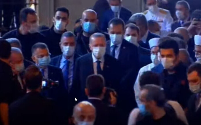 Ο Τούρκος Πρόεδρος φορώντας μάσκα, κατέφτασε στην Αγία Σοφία που έχει μετατραπεί πλέον από μουσείο σε τζαμί, λίγο πριν την έναρξη της μεγάλης προσευχής.
