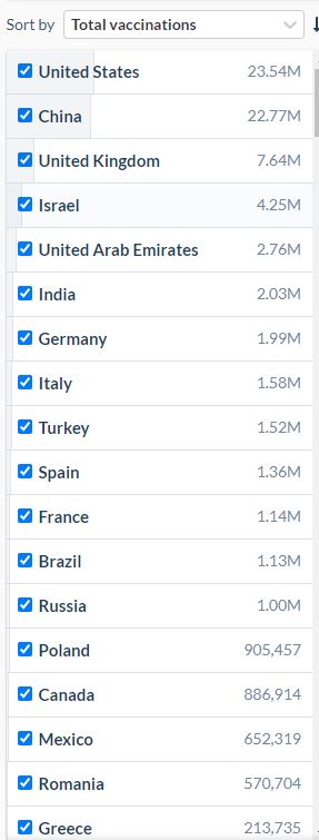 Σύμφωνα με τα ίδια στοιχεία, τα περισσότερα εμβόλια έχουν γίνει στις ΗΠΑ, καθώς φτάνουν τα 23.54 εκατομμύρια. Ακολουθούν Κίνα (22.77 εκατ.), Βρετανία (7.64 εκατ.), Ισραήλ (4.65 εκατ.) και Ηνωμένα Αραβικά Εμιράτα (2.76 εκατ).