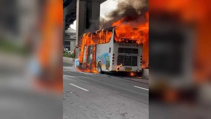 Βίντεο από το σημείο έδειξαν το λεωφορείο να τυλίγεται στις φλόγες κάτω από μια υπερυψωμένη διάβαση, με τεράστια σύννεφα πυκνού μαύρου καπνού να υψώνονται στον ουρανό.