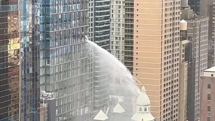 Βίντεο δείχνει το νερό να πετάγεται δεκάδες μέτρα πάνω από το έδαφος σε ένα κτίριο στη Δυτική 42η οδό και την Όγδοη λεωφόρο πριν πέσει στον δρόμο.