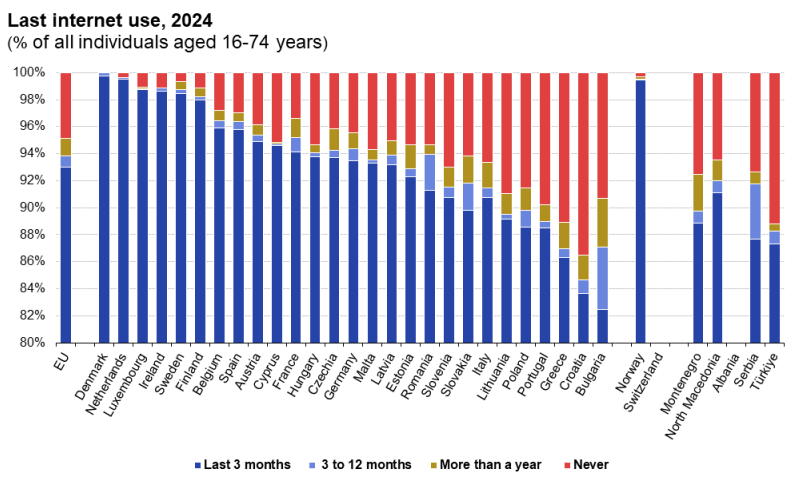 Ωστόσο, σχεδόν το 5% του πληθυσμού της ΕΕ δεν έχει μπει ποτέ στο διαδίκτυο. Σύμφωνα με τη Eurostat, το 13,5% των ανθρώπων στην Κροατία δεν είχαν χρησιμοποιήσει ποτέ το διαδίκτυο μέχρι το 2024. Ακολουθούν η Ελλάδα με αντίστοιχο ποσοστό 11,1%, η Πορτογαλία με 9,8% και η Βουλγαρία με 9,3%.