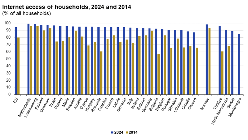 Το 94% όλων των νοικοκυριών που ερευνήθηκαν στην ΕΕ το 2024 είχε πρόσβαση στο διαδίκτυο. Το 2024, τα υψηλότερα ποσοστά σύνδεσης στο διαδίκτυο καταγράφηκαν στην Ολλανδία και το Λουξεμβούργο με 99% (βλ. Σχήμα 1). Υψηλά ποσοστά είχαν επίσης η Φινλανδία και η Δανία (και οι δύο με 97%).