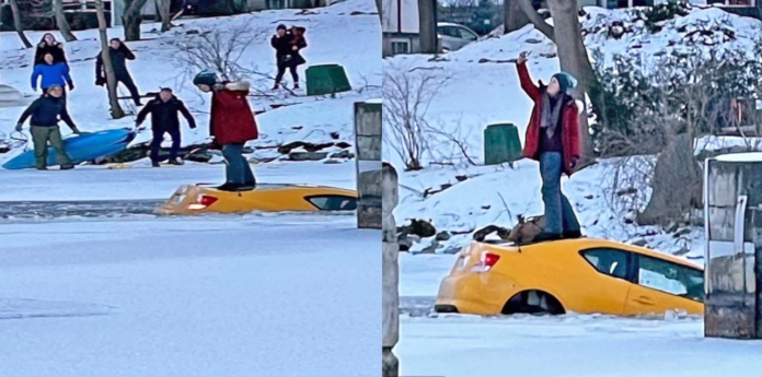 Ανεβασμένη στο καπό του αυτοκινήτου της που βυθιζόταν στα παγωμένα νερά ενός ποταμού στον Καναδά μια νεαρή γυναίκα πόζαρε για selfies
