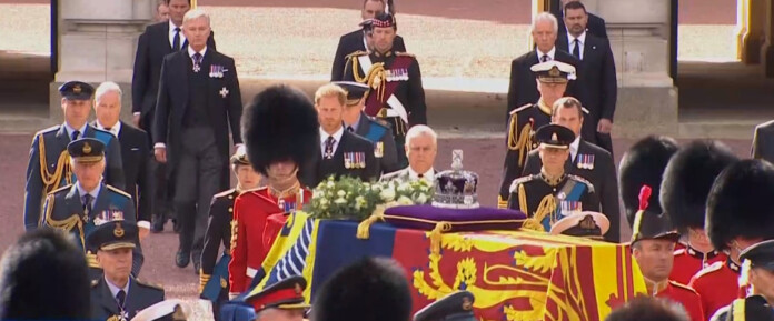 Στις 16:22 ακριβώς η λαμπρή αλλά σιωπηλή πομπή ξεκίνησε από το Μπάκινγχαμ προς την κεντρική αίθουσα του βρετανικού κοινοβουλίου όπου η σορός της Βασίλισσας θα εκτεθεί σε λαϊκό προσκύνημα.