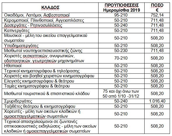 Οικοδόμου, λατόμου, ασβεστοποιού, κεραμοποιού, πλινθοποιού, αγγειοπλάστη, δασεργάτη, ρητινοσυλλέκτη, καπνεργάτη, μουσικού – μέλους του οικείου επαγγελματικού σωματείου, υποδηματεργάτη, μισθωτού ναυπηγοεπισκευαστικής ζώνης, χειριστή εκσκαπτικών, ανυψωτικών, οδοποιητικών, γεωτρητικών μηχανημάτων, ηθοποιού, τεχνικού κινηματογράφου και τηλεόρασης χειριστή και βοηθού χειριστή κινηματογράφου, ελεγκτή κινηματογράφου και θεάτρου, ταμία κινηματογράφου και θεάτρου, μισθωτού τουριστικού και επισιτιστικού κλάδου, σμυριδεργάτη, το επάγγελμα του ταξιθέτου θεάτρου – κινηματογράφου, του χορευτή – μέλους των οικείων κλαδικών ή ομοιοεπαγγελματικών σωματείων, καθώς και του τεχνικού απασχολούμενου σε ζωντανές οπτικοακουστικές εκδηλώσεις – μέλους των οικείων κλαδικών ή ομοιοεπαγγελματικών σωματείων.