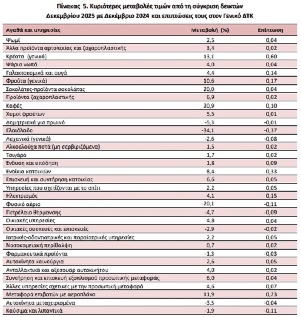 Όπως ανακοίνωσε η ΕΛΣΤΑΤ, η αύξηση του γενικού δείκτη τιμών καταναλωτή τον Δεκέμβριο πέρυσι προήλθε κυρίως από τις μεταβολές στις ακόλουθες ομάδες αγαθών και υπηρεσιών: