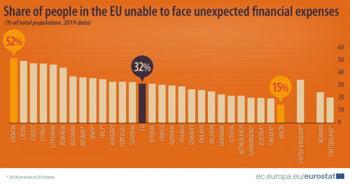 Η αδυναμία αντιμετώπισης απροσδόκητων οικονομικών εξόδων στις χώρες της ΕΕ βρίσκεται σε υψηλά επίπεδα στην Κροατία ενώ τα χαμηλότερα ποσοστά σημειώθηκαν στη Μάλτα. Μεταξύ των κρατών μελών της ΕΕ, το μερίδιο των ατόμων που δεν μπορούσαν να αντιμετωπίσουν απροσδόκητα οικονομικά έξοδα ήταν υψηλότερο στην Κροατία, με ποσοστό 52%.