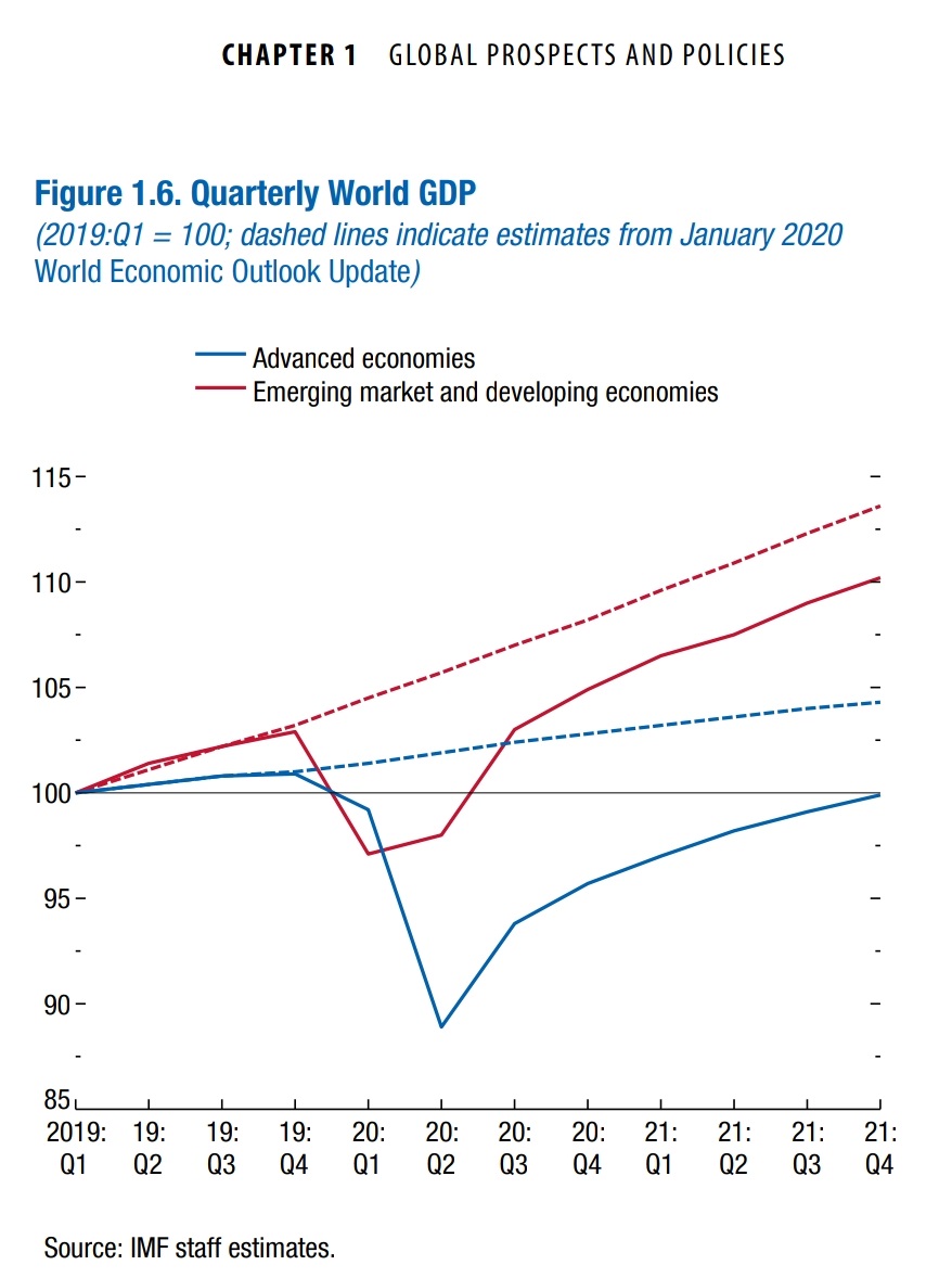 Σε αυτό το «μαύρο» κεφάλαιο της Έκθεσης του ΔΝΤ, το οποίο είναι αφιερωμένο στη Μεγάλη Καραντίνα (Great Lockdown) οι οικονομολόγοι του Ταμείου κάνουν λόγο για κρίση, που δεν μοιάζει με καμία άλλη, καθώς η ανάγκη περιορισμού της διασποράς του ιού, υποχρέωσε στη λήψη πρωτοφανών μέτρων αναστολής οικονομικών δραστηριοτήτων, ενώ παράλληλα πρέπει να ρέει κρατικό χρήμα για τη στήριξη επιχειρήσεων- νοικοκυριών.