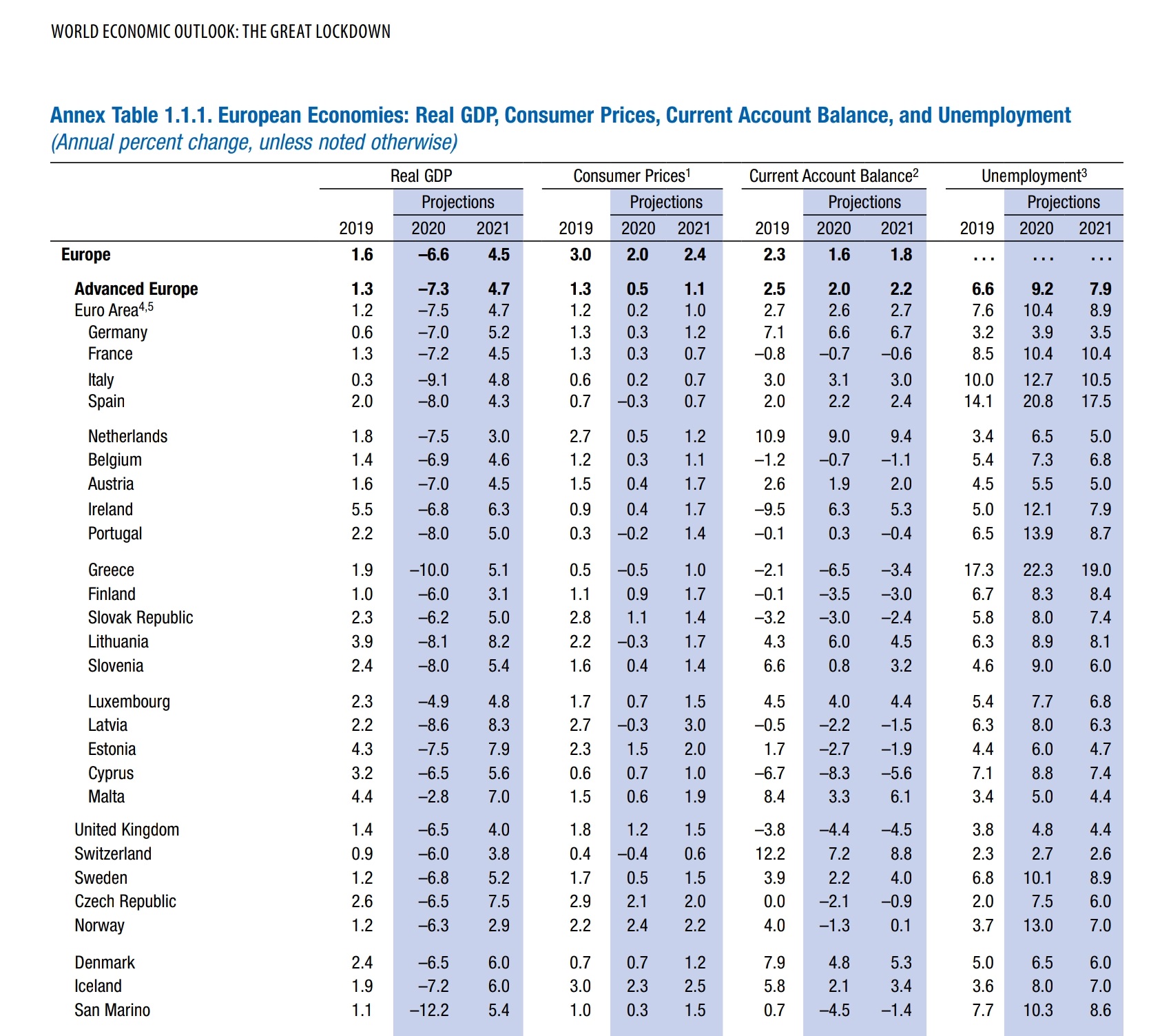 Οι πληροφορίες αναφέρουν ότι στις ομάδες εργασίας, που έχουν στηθεί από το ξέσπασμα της κρίσης στο υπουργείο Οικονομικών, έχουν επεξεργαστεί ακραία σενάρια με ύφεση σε διψήφια ποσοστά. Όμως, το ΔΝΤ, στην επικαιροποιημένη Έκθεση του για την Παγκόσμια Οικονομία (World Economic Outlook), υπολογίζει ότι με το βασικό του σενάριο, δηλαδή τις καλλίτερες παραδοχές, η ύφεση στην Ελλάδα θα φτάσει στο 10%! Πρόκειται για το μεγαλύτερο ποσοστό ύφεσης στην Ευρωζώνη, η οποία επίσης θα βυθιστεί στο -7,5% κι ένα από τα μεγαλύτερα στον κόσμο, αν λάβει κανείς υπόψιν ότι μόνο το Σαν Μαρίνο (-12,2%) και το Μακάο (-29,6%) εκτιμάται ότι θα βρεθούν σε χειρότερη θέση!