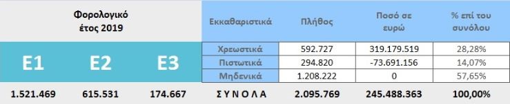 Από τα στοιχεία προκύπτει επίσης ότι έχουν εκκαθαριστεί συνολικά 2.095.769 φορολογικές δηλώσεις (Ε1, Ε2, Ε3), εκ των οποίων οι 1.208.222 (57,6%) είναι μηδενικές. Επιπλέον, 592.727 φορολογικές δηλώσεις (το 28,2% του συνόλου) είναι χρεωστικές (προκύπτει φόρος), ενώ 294.820 (14%) είναι πιστωτικές (επιστροφή φόρου).