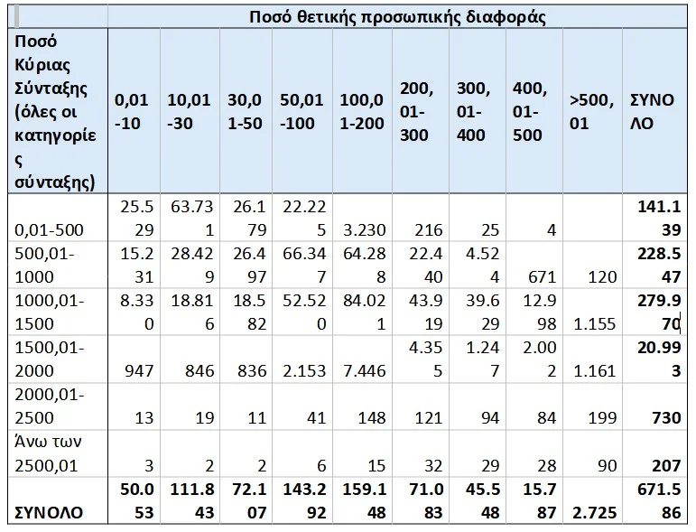 Πίνακας: Κατανομή συνταξιούχων με προσωπική διαφορά ανά ποσό σύνταξης και ποσό προσωπικής διαφοράς