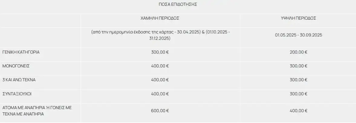 - ανάλωση του ποσού εφάπαξ ή τμηματικά ανάλογα με την περίοδο που έχει επιλέξει ο κάθε δικαιούχος (30.09.2025 για την υψηλή περίοδο, 31.12.2025 για την υψηλή περίοδο), ώστε να υποστηριχθεί και η επιλογή διακοπών εκτός υψηλής τουριστικής περιόδου.