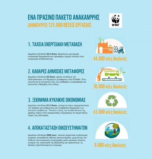 Η έκθεση του WWF Ελλάς υπό τον τίτλο «Πράσινη Ανάκαμψη για την Ελλάδα», δείχνει πως η χρήση περίπου 8,2 δισεκ. ευρώ προς πράσινες επενδύσεις από αυτή τη χρηματοδότηση, μπορεί να οδηγήσει στη δημιουργία έως και 125.000 νέων θέσεων εργασίας.
