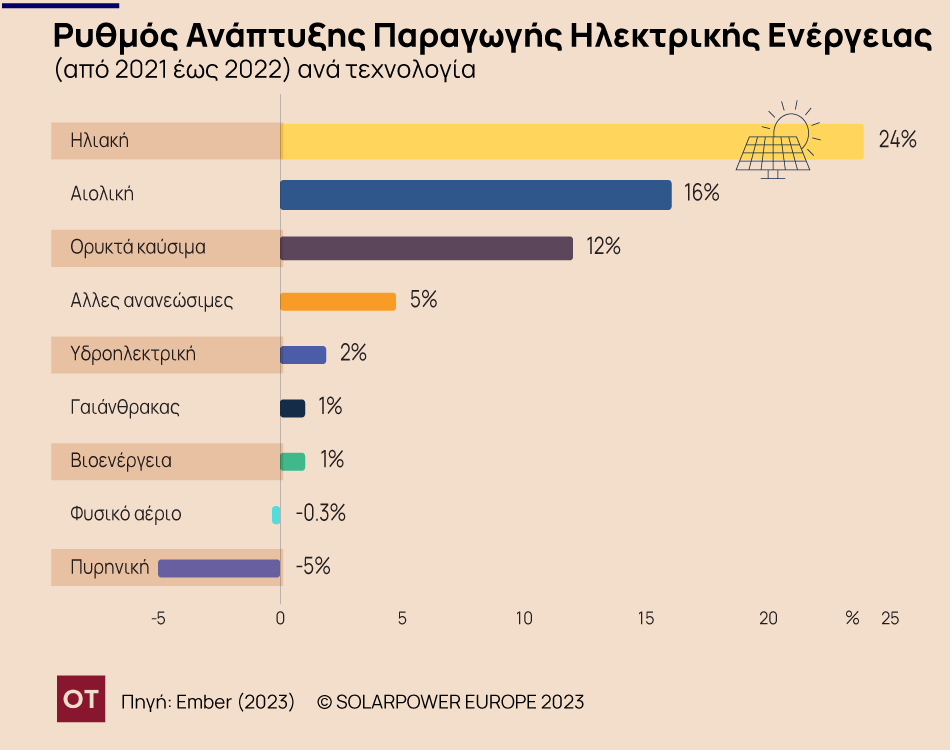 Αυτό προκύπτει από την τελευταία έκδοση του Global Market Outlook 2023-2027 της SolarPower Europe, η οποία παρουσιάστηκε κατά τη διάρκεια της Intersolar Europe που πραγματοποιείται αυτές τις μέρες στο Μόναχο της Γερμανίας. Ειδικά, για τα φωτοβολταϊκά στέγης, έξι χώρες μεταξύ των οποίων και η χώρα μας (Δανία, Ινδία, Αυστρία, Κίνα, Ελλάδα και Νότια Αφρική) παρουσίασαν πέρυσι ρυθμούς ανάπτυξης που ξεπερνούσαν το 50%.