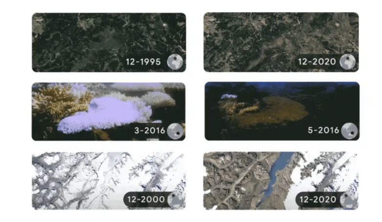 Άλλες εικόνες αποτυπώνουν το αποτέλεσμα της λεύκανσης των κοραλλιών στον Μεγάλο Κοραλλιογενή Ύφαλο κοντά στο νησί Lizard στην Αυστραλία μεταξύ Μαρτίου 2016 και Οκτωβρίου 2017 και της αποψίλωσης των δασών Harz στο Elend της Γερμανίας, μεταξύ Δεκεμβρίου 1995 και 2020.