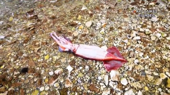 Eνα γιγάντιο καλαμάρι εντοπίσθηκε νεκρό στην παραλία Καραθώνας στο Ναύπλιο, την Δευτέρα.