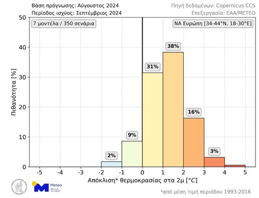 Πιο συγκεκριμένα, τα πιθανότερα σενάρια είναι να σημειωθούν αποκλίσεις της τάξης των 1-2°C (38%) και 0-1°C (31%), ενώ η πιθανότητα για μέσες θερμοκρασιακές αποκλίσεις άνω των 2°C είναι περίπου 19%. Τέλος, υπάρχει 11% πιθανότητα να έχουμε χαμηλότερη του κανονικού μέση θερμοκρασία.
