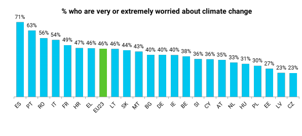 Από τους ερωτηθέντες στην Ελλάδα (1.030 νέοι), το 46% δηλώνουν εξαιρετικά ανήσυχοι για την κλιματική αλλαγή, ποσοστό που φέρνει τη χώρα μας στην έβδομη θέση ανάμεσα στις μετέχουσες στη δημοσκόπηση.