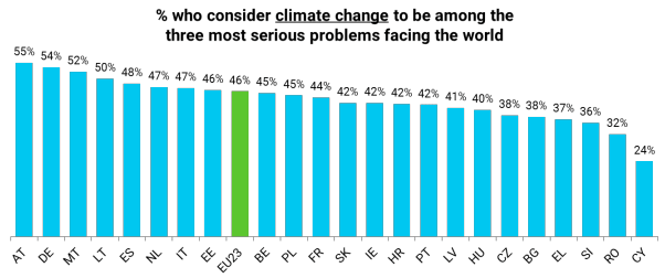 Όμως, το 37% δήλωσε ότι θεωρεί την κλιματική αλλαγή ένα από τα τρία σοβαρότερα προβλήματα που αντιμετωπίζει ο κόσμος, ποσοστό που φέρνει την Ελλάδα στην 20η θέση. Το υψηλότερο ποσοστό καταγράφεται στην Αυστρία, με 55%.