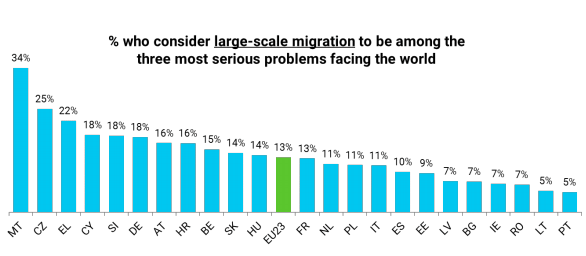 Στην Ελλάδα, το 22% των ερωτηθέντων τοποθέτησε τη μεγάλη έκτασης μετανάστευση ανάμεσα στα τρία σοβαρότερα προβλήματα, ποσοστό που φέρνει τη χώρα μας στην τρίτη θέση, πίσω από τη Μάλτα (34%) και την Τσεχία (25%).