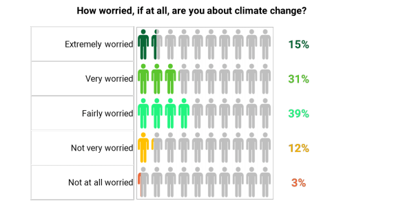 Επιπλέον, ακόμη κι εκείνοι που δεν βάζουν το κλίμα στις κορυφαίες προτεραιότητες, ανησυχούν για αυτό το θέμα. Το 84% των ερωτηθέντων απαντούν ότι ανησυχούν για την κλιματική αλλαγή και το 65% εκτιμούν ότι αυτή θα τους επηρεάσει άμεσα.