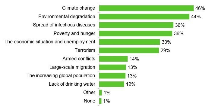 Στη δημοσκόπηση απάντησαν περισσότεροι από 22.000 πολίτες, 15-35 ετών, σε 23 ευρωπαϊκές χώρες. Πέρα από την κλιματική αλλαγή, την υποβάθμιση του περιβάλλοντος και τη διάδοση μεταδοτικών ασθενειών τα μεγαλύτερα προβλήματα της ανθρωπότητας, σύμφωνα με τους ερωτηθέντες, είναι: φτώχεια και πείνα (36%), οικονομική κατάσταση και ανεργία (30%), τρομοκρατία (29%), ένοπλες συγκρούσεις (14%), μεγάλης κλίμακας μετανάστευση (13%), αύξηση παγκόσμιου πληθυσμού (13%), έλλειψη πόσιμου νερού (12%).