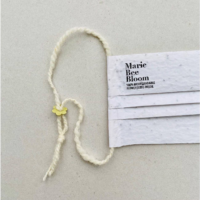 Αντί για λάστιχα, έχουν απαλά κορδόνια από αγνό μαλλί προβάτου. Οι σπόροι λουλουδιών μένουν στη μάσκα με τη χρήση μιας ειδικής κόλλας που είναι φτιαγμένη από νερό και άμυλο πατάτας. Και εκτός από όλα τα άλλα βιώσιμα υλικά από τα οποία είναι φτιαγμένη η βιοδιασπώμενη μάσκα, ακόμα και το logo είναι γραμμένο με ειδικό βιώσιμο μελάνι.