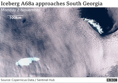 Το A68a ακολουθεί αυτή τη διαδρομή από τότε που απελευθερώθηκε από την Ανταρκτική στα μέσα του 2017 και πλέον είναι μόλις μερικές εκατοντάδες χιλιόμετρα νοτιοδυτικά της περιοχής. To παγόβουνο αποκολλήθηκε από την παγοκρηπίδα Larsen C στα ανατολικά της χερσονήσου της Ανταρκτικής τον Ιούλιο του 2017 και σήμερα έχει μήκος σχεδόν 150 χιλιόμετρα και πλάτος 48.