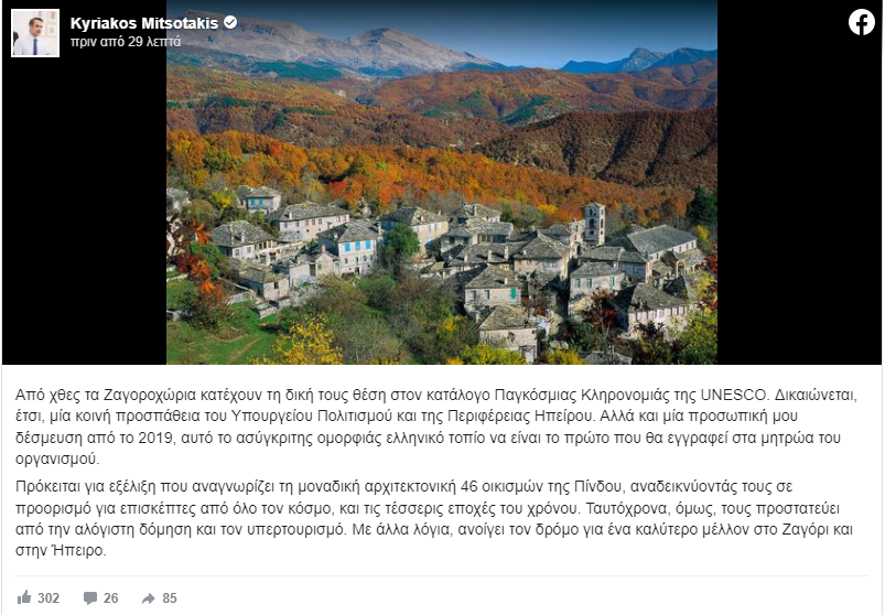 Στην ανάρτηση που έκανε στο Facebook, με αφορμή την εγγραφή του Ζαγορίου στον κατάλογο Παγκόσμιας Κληρονομιάς της UNESCO, γράφει ο Κυριάκος Μητσοτάκης: