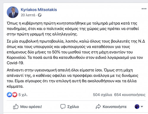 Με ανάρτησή του στο Facebook, ο κ. Μητσοτάκης κάλεσε τόσο τους βουλευτές όσο και τα υπόλοιπα στελέχη της κυβέρνησης, να καταθέσουν το ήμισυ του μισθού τους, τους επόμενους δύο μήνες, για την ενίσχυση του ειδικού λογαριασμού κατά του κορωνοϊού.