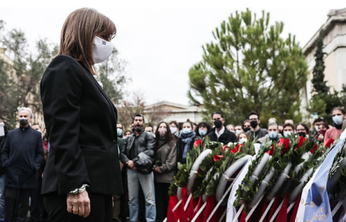 Η Πρόεδρος της Δημοκρατίας Κατερίνα Σακελλαροπούλου κατέθεσε στεφάνι σήμερα το πρωί στο Πολυτεχνείο για τον εορτασμό της 48ης επετείου από την εξέγερση κατά της δικτατορίας των συνταγματαρχών.