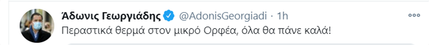 Η είδηση, ωστόσο, της προσβολής του μικρού Ορφέα από κορωνοϊό προκάλεσε πάνδημο ενδιαφέρον, με χιλιάδες μηνύματα για ταχεία ανάρρωση να συνοδεύουν την ανάρτηση του κ. Τσίπρα, μεταξύ των οποίων και οι ευχές του Πρωθυπουργού, Κυριάκου Μητσοτάκη.