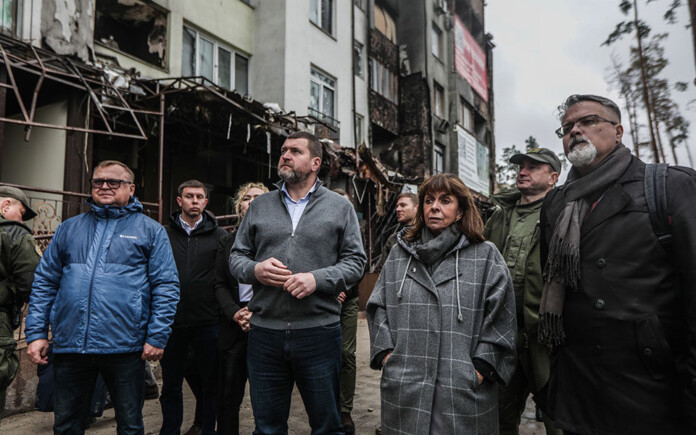 Στη Μπούτσα, η κυρία Σακελλαροπούλου περιηγήθηκε στο σημείο που βρέθηκαν ομαδικοί τάφοι Ουκρανών πολιτών στον περίβολο της εκκλησίας του Αγίου Ανδρέα και είδε φωτογραφική έκθεση με αμάχους θύματα του πολέμου.