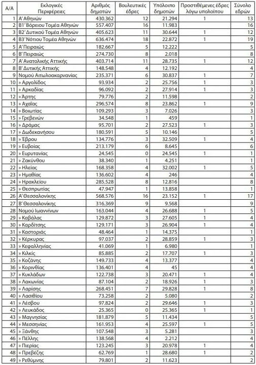 Αντίθετα, από μία έδρα χάνουν οι εκλογικές περιφέρειες Α΄ Αθηνών, Α΄ Πειραιώς, Άρτας, Κοζάνης, Μαγνησίας, Σερρών, Φθιώτιδας, Θεσπρωτίας και Καστοριάς. Οι δύο τελευταίες περιφέρειες γίνονται μονοεδρικές.